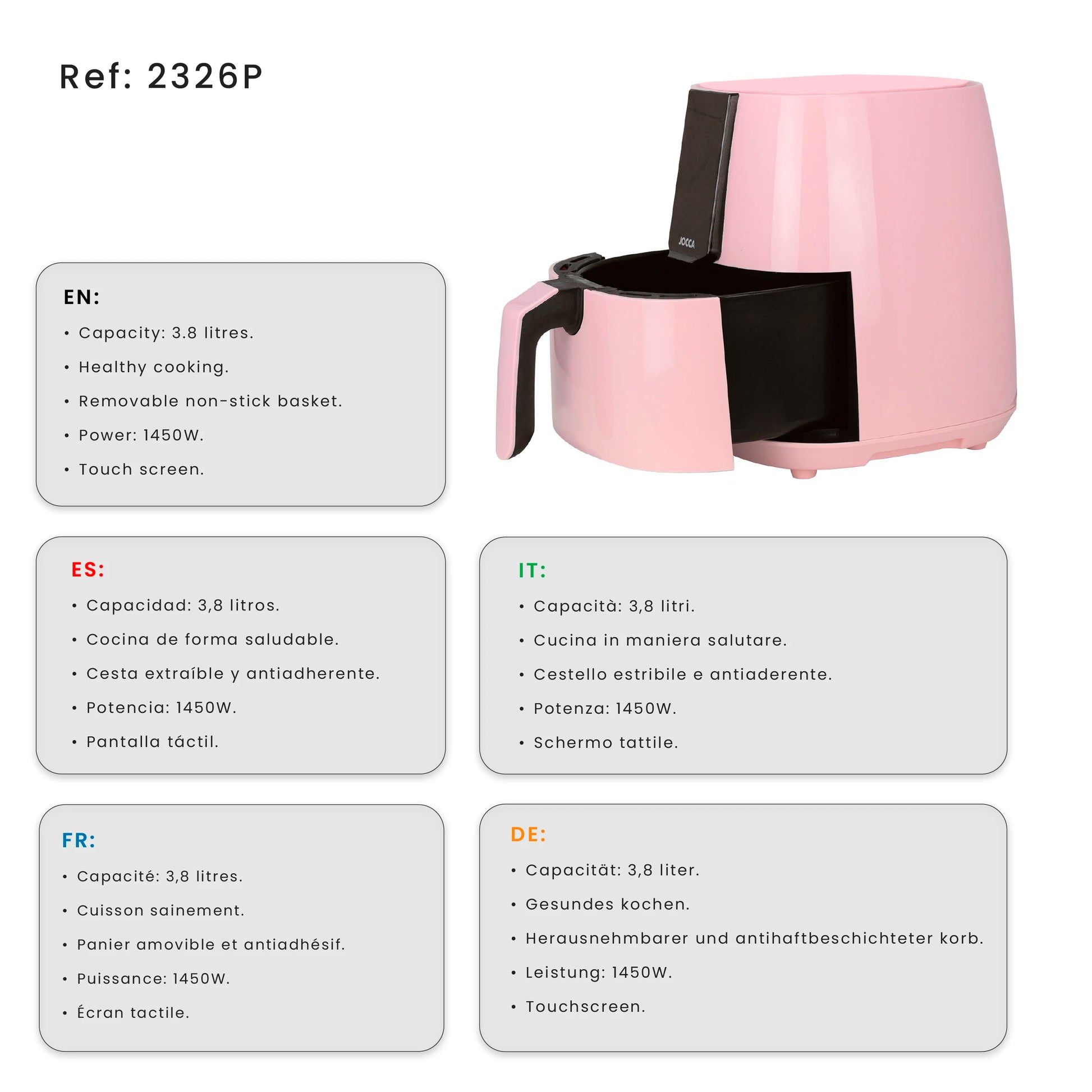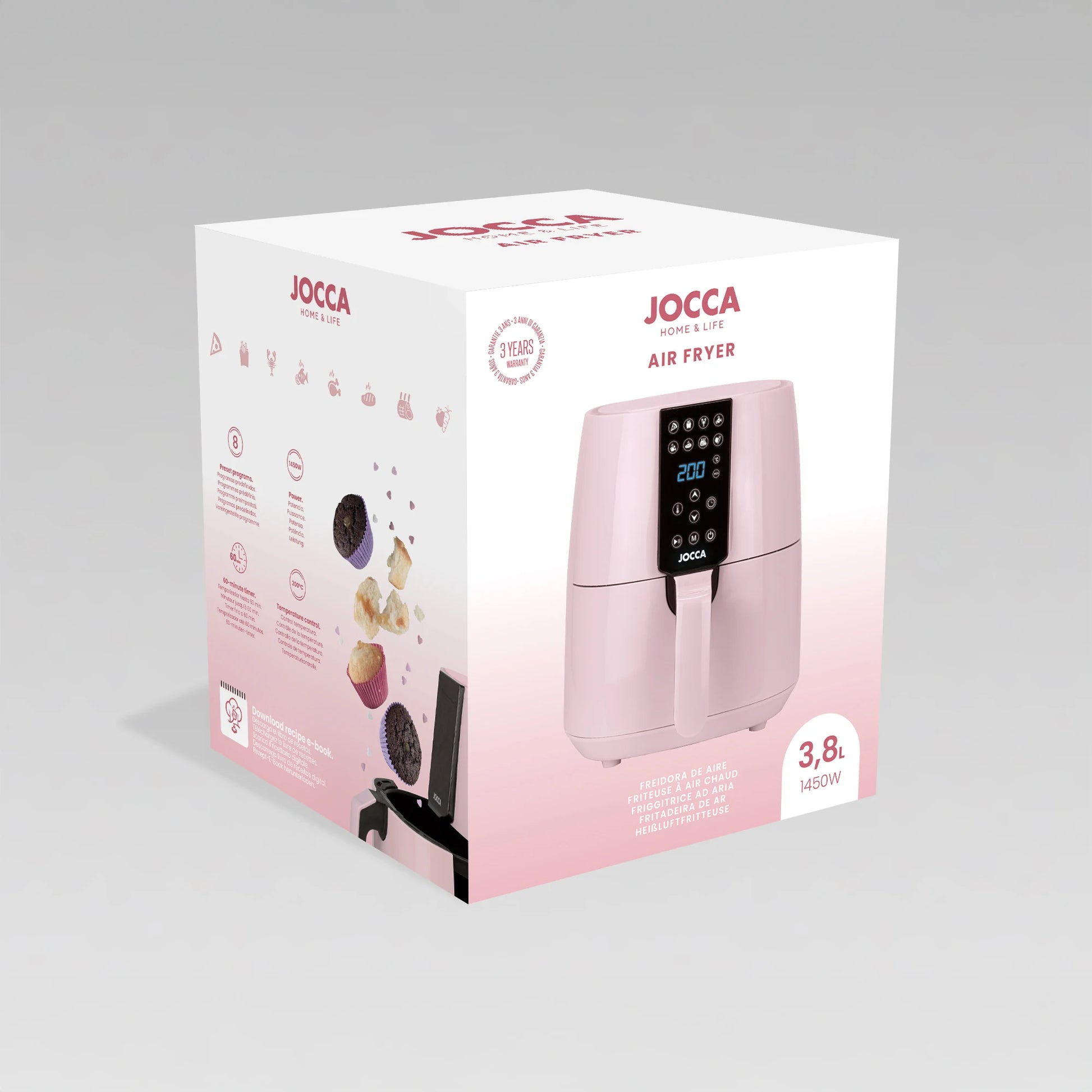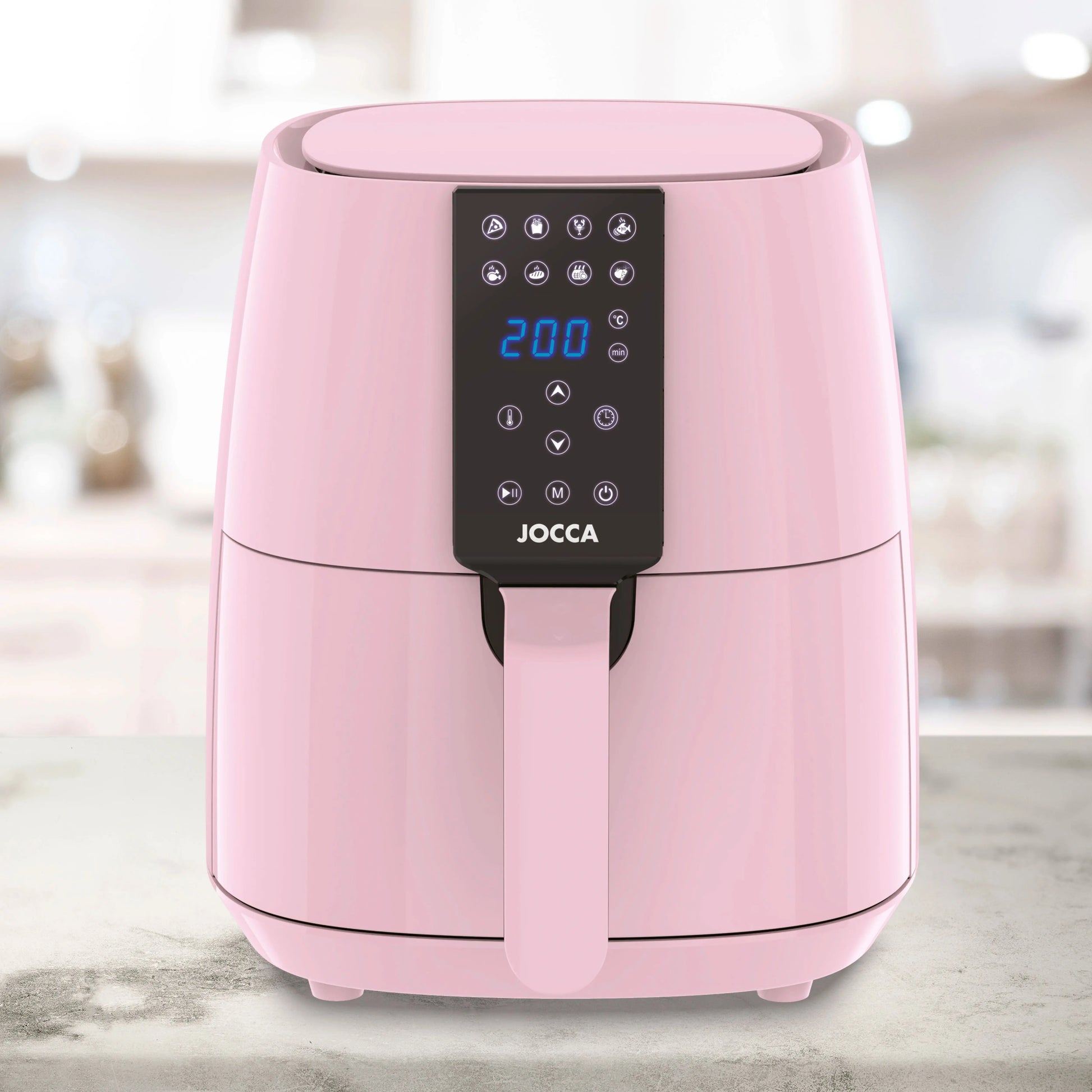3.8L capacity Jocca pink air fryer with LED touch screen, 8 predefined programs, 80-200 °C temperature, 60 min timer and 1450W power. Oil-free cooking, healthier and faster